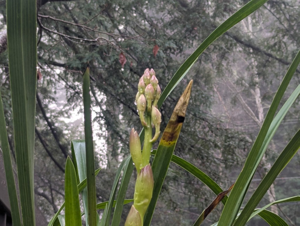 2. Cymbidium spp., orchid is not blooming yet, but is working on it. No such bloom was expected, since this formerly large specimen was divided thoroughly after its last bloom.