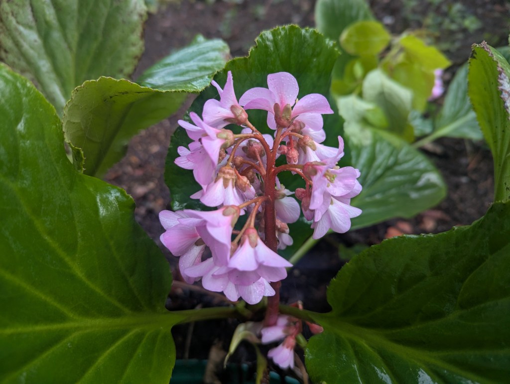 4. Bergenia crassifolia, pigsqueak bloomed with a few premature flowers for December, but is blooming more on time now. The flowers are nice whenever they choose to bloom.
