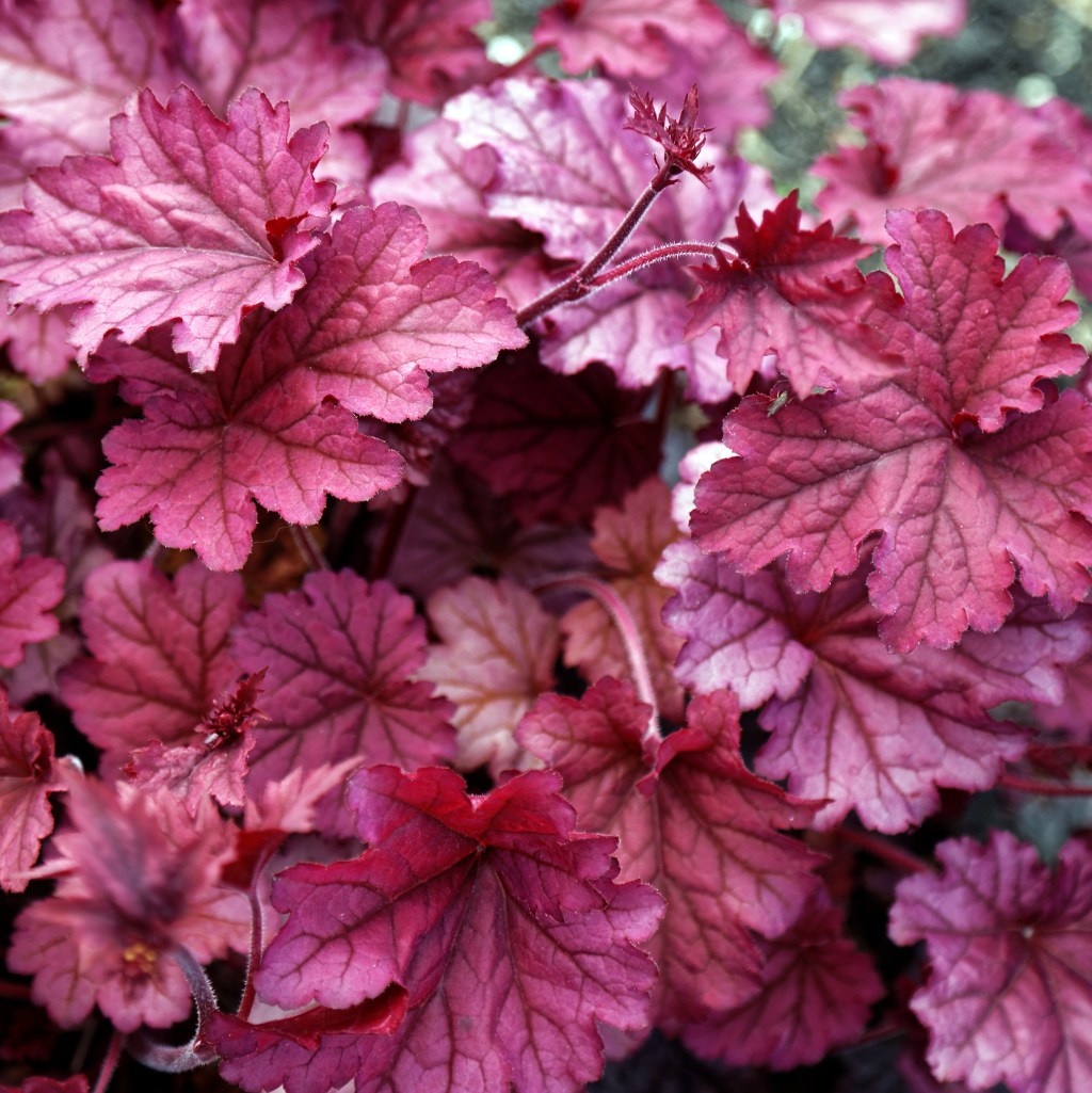 Modern cultivars are considerably more interesting, with more substantial foliage in various shades of green, gold, tan, brown, bronze and purplish bronze. The larger and variably lobed leaves can be two inches wide or slightly wider. The flowers stand as much as two feet high, but lack color. Most are pale greenish white. ‘Palace Purple’ has deep bronze or almost purplish foliage. ‘Ruffles’ has deeply lobed and ruffled green leaves. Unlike undemanding wild plants that can grow in cracks in exposed stone, modern cultivars like rich soil. Harsh exposure can scorch foliage, so a bit of partial shade is preferred.