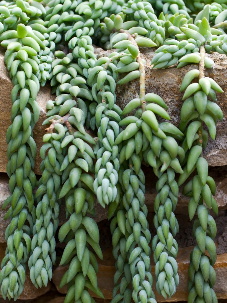 Back when big spider plants or Boston ferns suspended in fancy beaded macrame were all the rage through the 1970’s, burrow’s tail, Sedum morganianum, was an unusual but also trendy succulent perennial for sunny spots in the home or sheltered and slightly shaded spots in the garden. The refined foliar texture and light bluish green color contrasted nicely with the big and deep green leaves of comparably trendy philodendrons. The thin stems are too limber to stand up, but cascade excellently. Plants in the garden that get pruned back while dormant in winter can easily get two feet long through summer. Without pruning, big plants can get longer than six feet. Pruning scraps and even the small but plump leaves can be rooted and grown into new plants. It is impossible to prune or even move burro’s tail without dislodging some of the leaves anyway. Watering should be regular but not excessive, but then minimal for plants in the garden through winter.