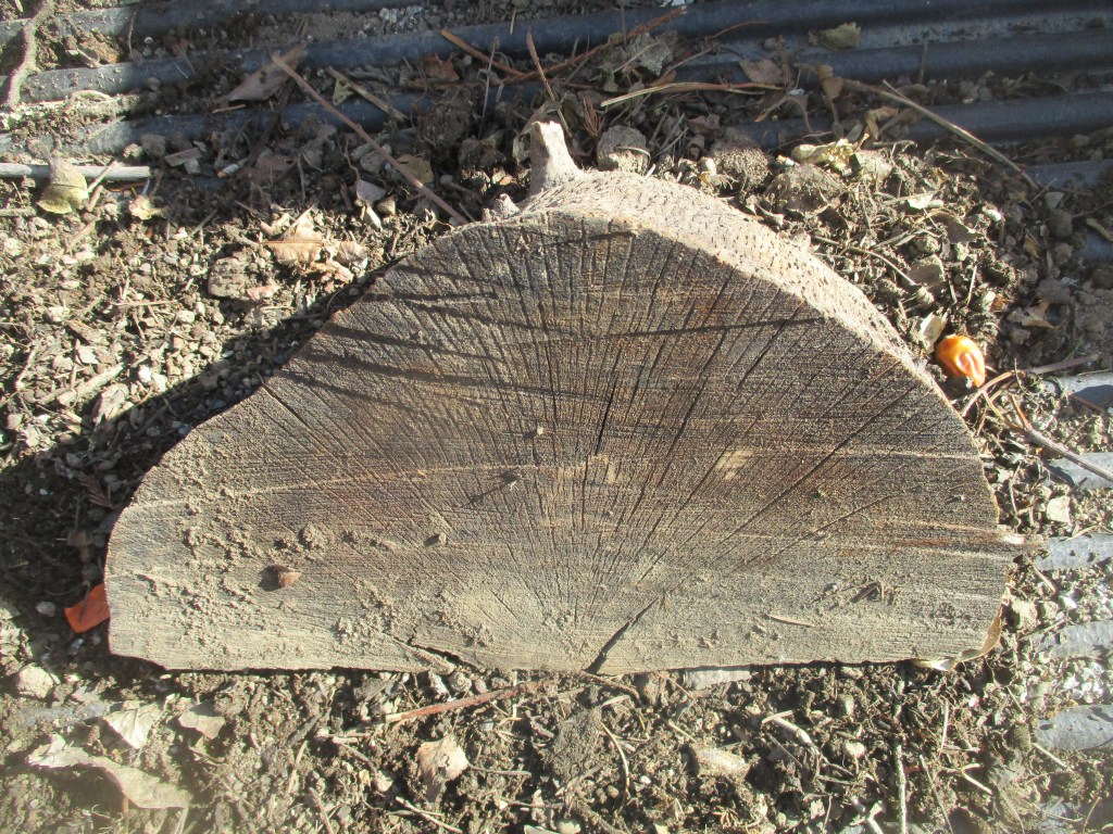 3. Arborists and lumberjacks cut wedges (notches) like this out of tree trunks, to direct their fall when cut down. This one is from a coast live oak. Now, it is an extra parking brake for Beau.