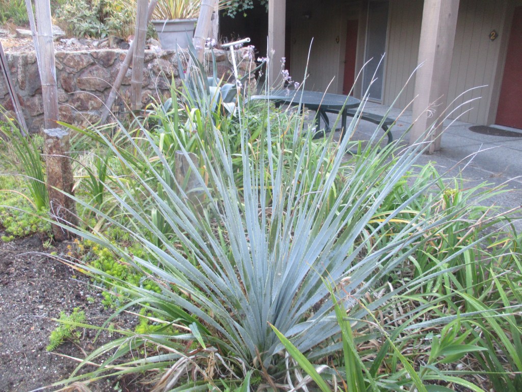 Of the fifty or so known species of Yucca, I formerly grew all but one. I still am not certain if the single species that I lacked, Yucca flexilis, is a real species or a synonym for another species. Of course, some species of Yucca might be considered to be subspecies of others. The genus is complicated. So is identification of its species. That is why I am not certain of the identity of the one Yucca that I got a picture of this week. Actually, only one of my Six, which live with the unidentified Yucca, are identified.