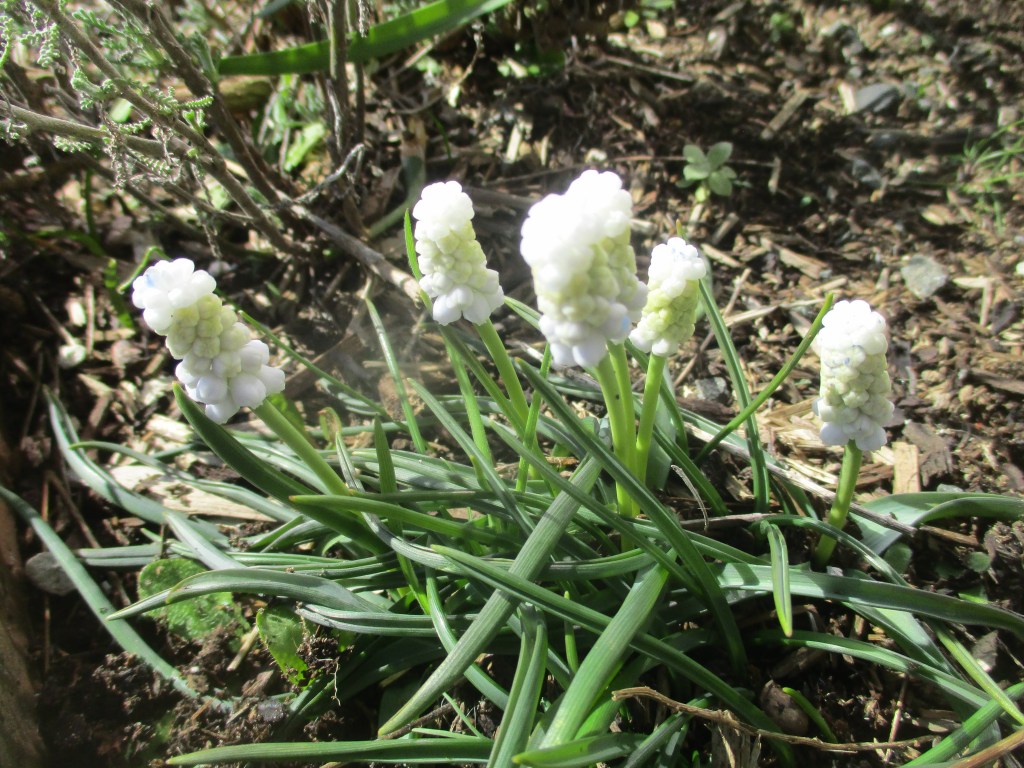 1. Yes! I know that I have been bragging abut them for days, but I feel as if I can continue bragging about them. My common blue grape hyacinth have been great (although I tried for many years to get rid of them). Nonetheless, I wanted white also, since white is my favorite color. I just could not justify ‘purchasing’ (oooh, bad word) any without some sort of significance. These are both white and significant. They came from Tangly Cottage Gardening, and are approved by Skooter!
