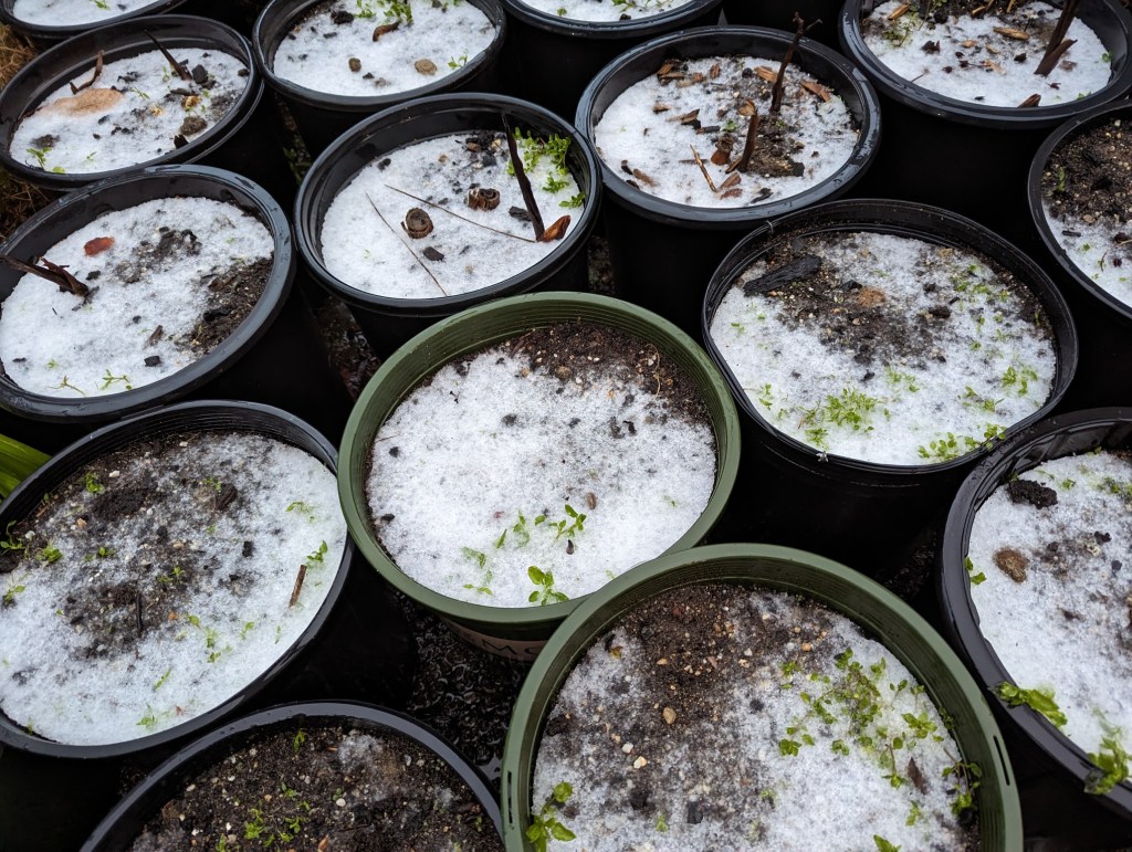 5. Canna is likewise incidental to this picture of what seems to be snow, but may merely be hail, which remained after the snow mostly melted. Canna are still dormant anyway.