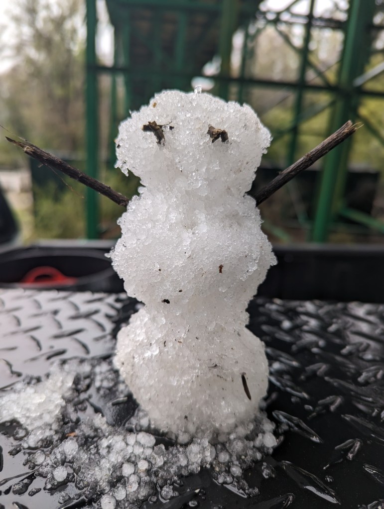 Snow?! That is crazy, although I love your snowman. I don’t blame Rhody for staying inside. It is not often I have to say this to you “keep warm”.