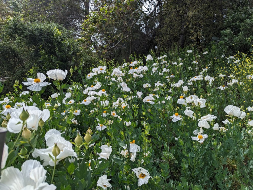 The flowers are interesting, but most are difficult to see up on top of all that vegetation. Even where they have room to grow and sprawl, most of the bloom is on top. The foliage is weirdly prickly. This is one poppy that is prettier in the wild than within refined home gardens.