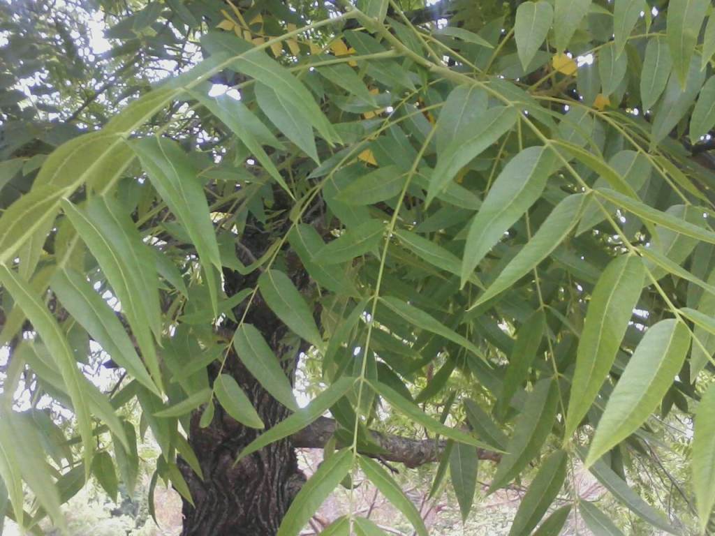 Although native, most local black walnut trees, Juglans hinsdii, are secondary growth from the rootstock of what were once grafted English walnuts, or descendents of such trees. (English walnut trees are grafted onto black walnut understock.) However, the massive old trees that flank the old Monterey Highway south of San Jose were planted as large shade trees nearly a century ago. They are now about sixty feet tall, with lofty broad canopies. Their foot long leaves are pinnately compound, with about eleven to nineteen slightly dentate leaflets that are about three or four inches long. The hard nuts and thick husks are far too messy for refined gardens.
