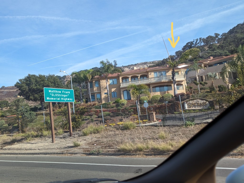 The illustration above is obviously not of exemplary quality. I took it from the car while driving. This was on northbound Highway 101, at the northern extremity of Pismo Beach. The palm to the upper left of the sign for Spyglass Pointe, with the yellow arrow pointing at it from above, is a fishtail palm. Until recently, it had been famously chlorotic.