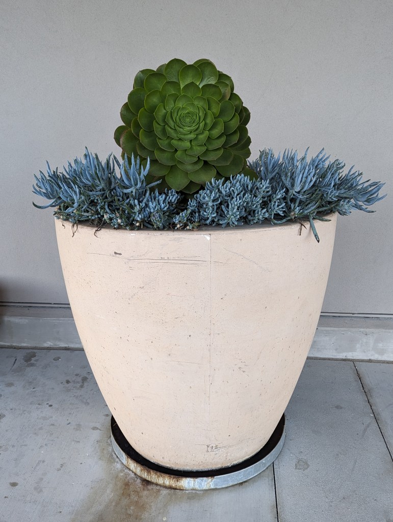 I can’t say that I am a fan of the color scheme of the planting either. The green of the aeonium doesn’t set off all the blue senecio well (wow, is auto-correct having issues with that sentence!) There’s such a range of colors in the succulent world–something more contrasting could have been chosen, particularly with such a neutral container.