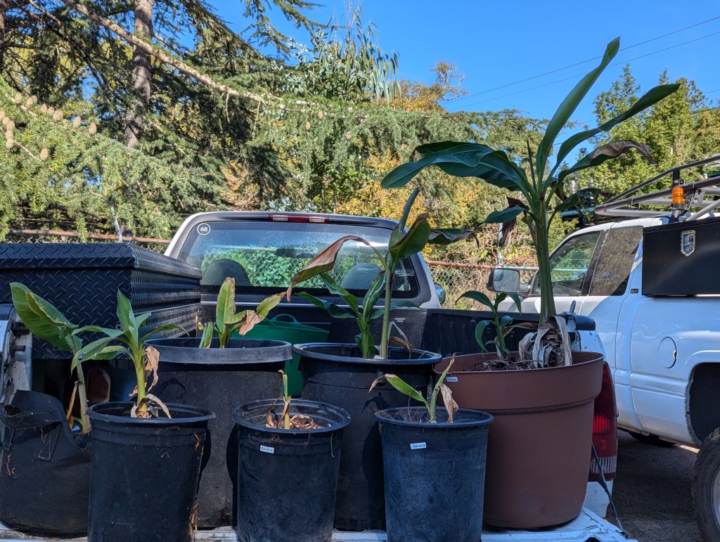 Yes! We have more bananas! I can explain. Although there are as many as twenty cultivars of banana here, almost all are individual pups or tissue culture plugs. (Of these twenty, three are unidentified. Of these three, one is likely a redundant copy of one of the other cultivars, one seems to be completely necrotic without possibility of recovery, and only one is notably distinct.) All but a few arrived earlier this year, so have not yet generated pups. ‘Double Mahoi’ has doubled by generating a single pup. ‘Golden Rhino Horn’ arrived as a pair, and one of the pair is only now beginning to generate another pair of pups. Otherwise, there are no spare pups to share. The only spare pups of ‘Double Mahoi’ and ‘Golden Rhino Horn’ (the one which lacks new pups) may be leaving in the next few days. Whatever remains of these two will most certainly go to another colleague at the end of winter. Another colleague would like to add any spares, regardless of cultivar, to his garden. However, until just now, I could not help in that endeavor. The few in the picture above just arrived from Gilroy because they were in need of a new home. The pup to the far left is ‘Blue Java’, which is also known as ‘Ice Cream’, is redundant to a copy that is already here, so can be shared with a colleague. The others, which are sufficiently numerous for all of us to get copies, are unidentified, which merely means that if they produce fruit, it will be a surprise. Even if their fruit is not palatable, their foliage is good for forage and compost. For the colleague who would like to add any spares regardless of cultivar, they can live in a riparian area of his garden that is too steep, damp and shady for gardening. These pups may not look like much in the picture, but their corms are quite plump, so will provide an abundance of foliage after they get into the ground and the weather warms after winter. Soon afterward, they will generate more pups, but we can worry about that later.
