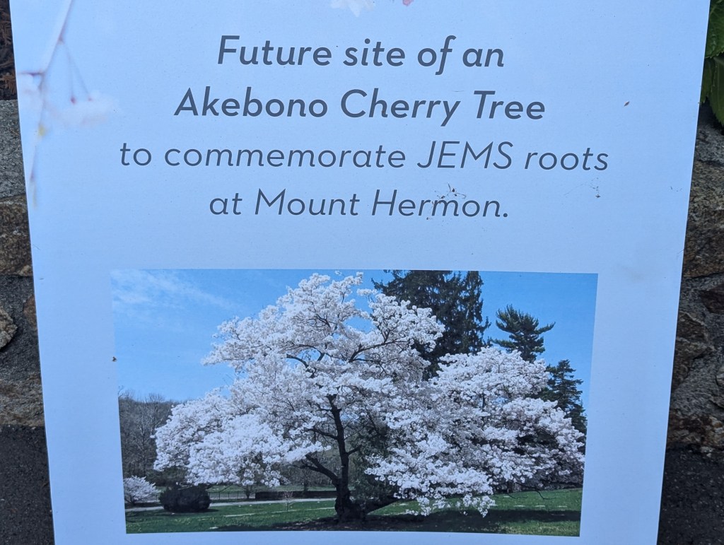 1. The Japanese Evangelical Missionary Society, or JEMS commemorated three quarters of a century of involvement with Mount Hermon with this gift of a flowering cherry tree.