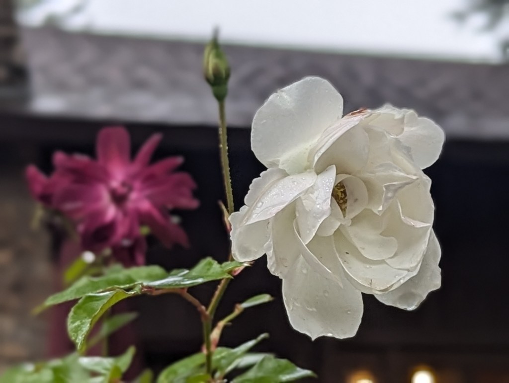 2. Rosa spp. ‘Iceberg’ rose should finish bloom anytime. That bud to its upper left is not likely to open now that the weather is cool for winter. ‘Burgundy Ice’, in the background, is grafted onto the same rose tree with this ‘Iceberg’. I think that they look odd together.