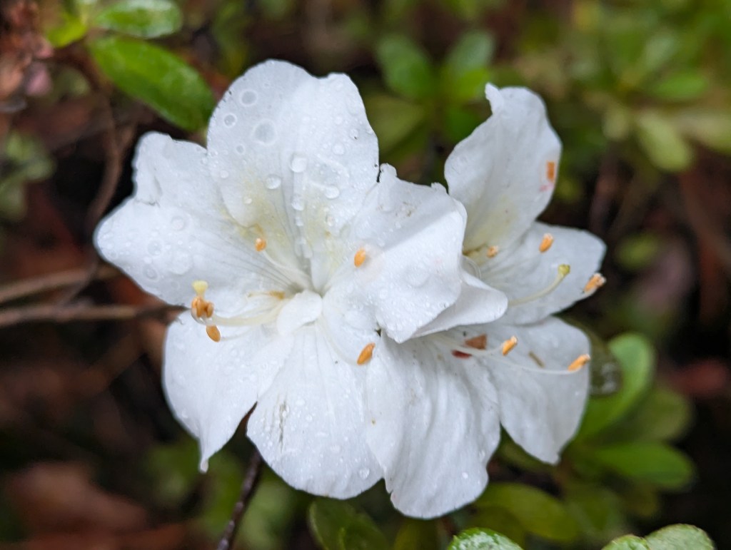 5. Rhododendron spp., azalea blooms lavishly for spring, but this particular unidentified cultivar also tosses out these few premature flowers for winter. Incidentally, it is merely coincidental that most of these Six bloom white. I just got pictures of what is prominent.