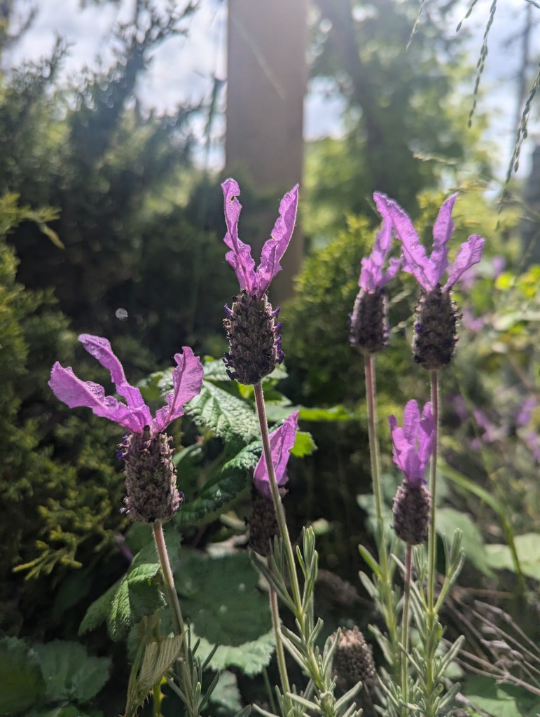 1. Lavandula stoechas, Spanish lavender posed for this picture, which was not adequate for the gardening column, but is too pretty to delete without sharing here. It looks like it is about to fly away with those long wings. A bee posed with it for the gardening column.