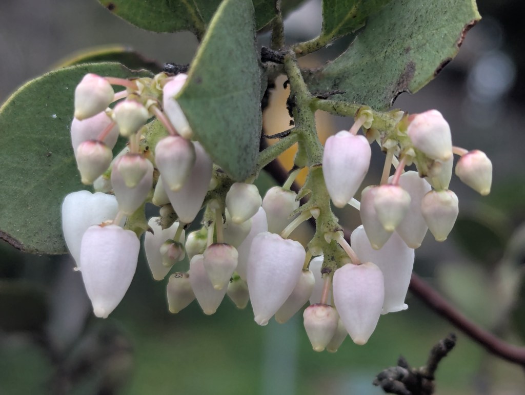 1. Arctostaphylos densiflora ‘Howard McMinn’ manzanita is the common cultivar of an uncommon species from Sonoma County to the North. It continues to bloom until April.
