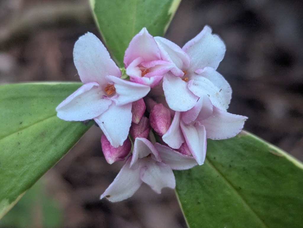 2. Daphne odora ‘Variegata’, variegated daphne seems to bloom better when distressed. This particular specimen is not as healthy as the others which are blooming a bit slower.