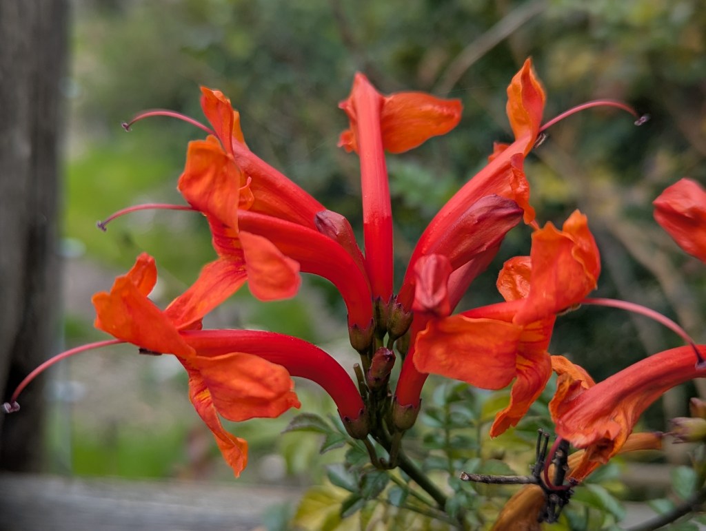 4. Tecomaria capensis, Cape honeysuckle is prettier close up than it is at a distance. It is awkward in form, but can not be pruned enough without eliminating some of its bloom.