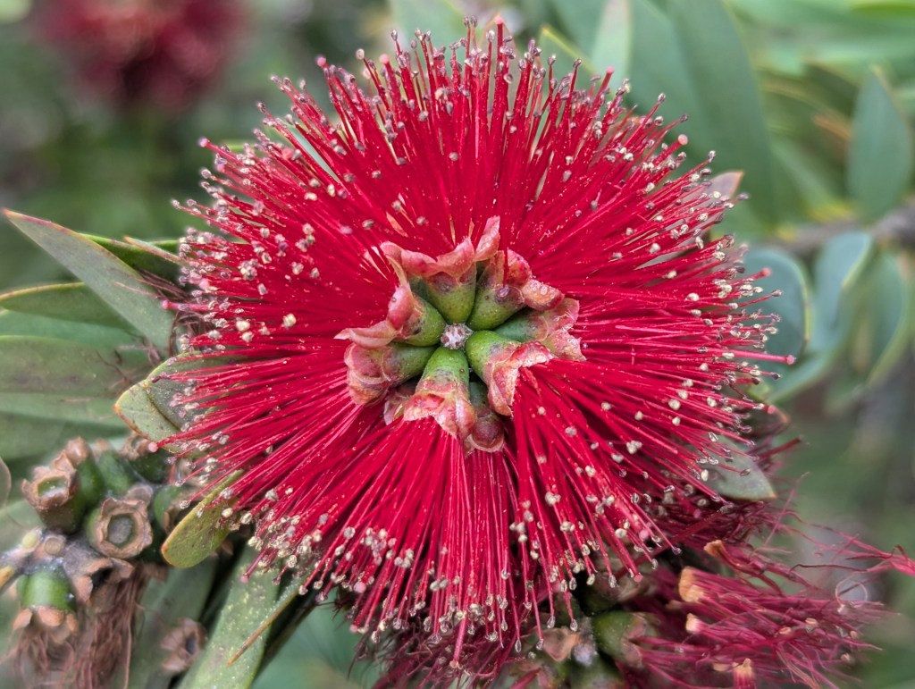 6. Callistemon viminalis ‘Little John’ dwarf bottlebrush technically should not bloom at this time of year either, but can bloom whenever the weather has been warm for a while.