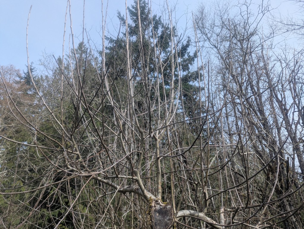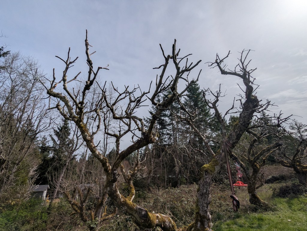 1. Apple trees before pruning look like a hot mess, particularly with the thicket of willow and other vegetation in their background, but are actually quite healthy and cooperative.