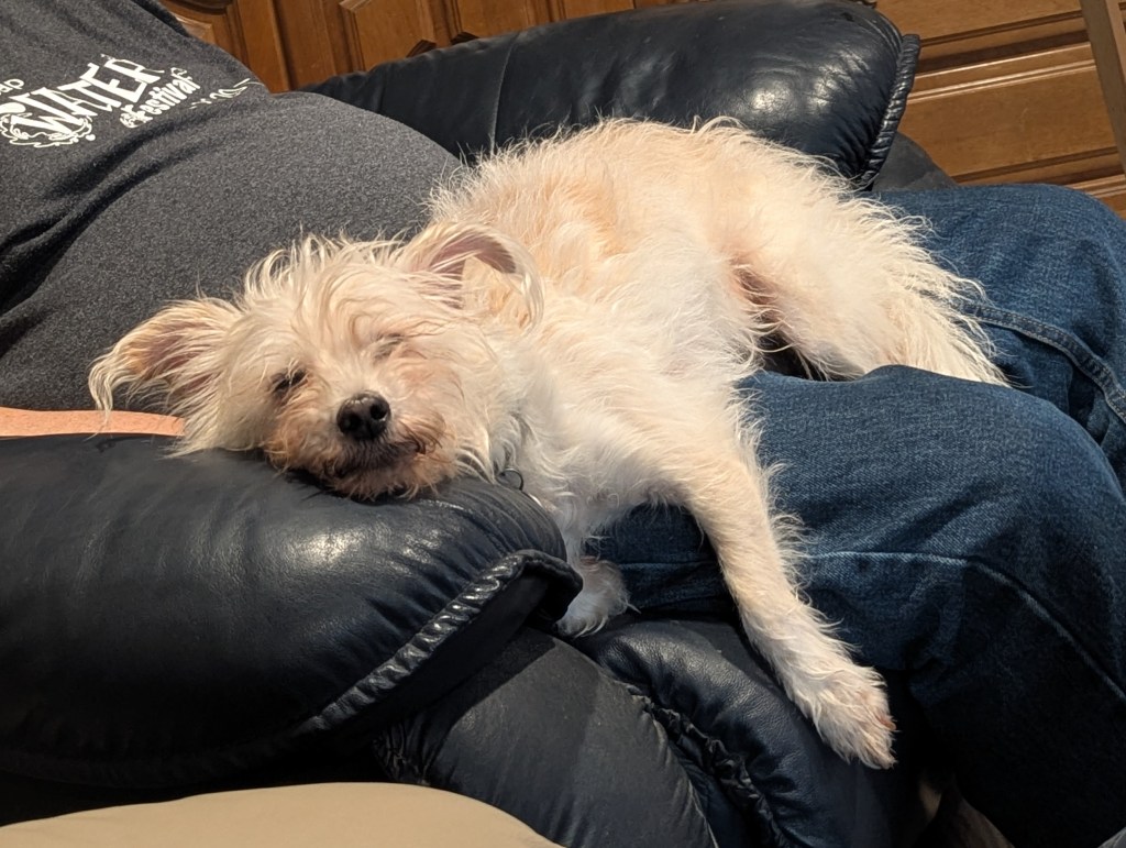 6. Rhody really knows how to relax on our vacation. He is very fond of my Pa, and enjoys lounging on his lap for as long as he can, typically with an inane movie on the television.