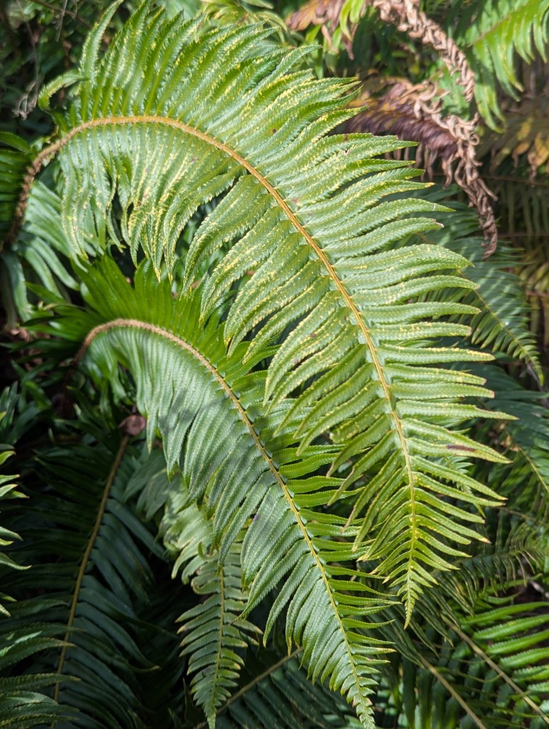 Of the native ferns, Western sword fern, Polystichum munitum, is the most common. Yet, it can be difficult to cultivate outside of its native range. Regional symbiotic soil microbes might be what limit its adaptability beyond its range. Locally in the wild, it prefers riparian situations. Within home gardens, established specimens are impressively undemanding.