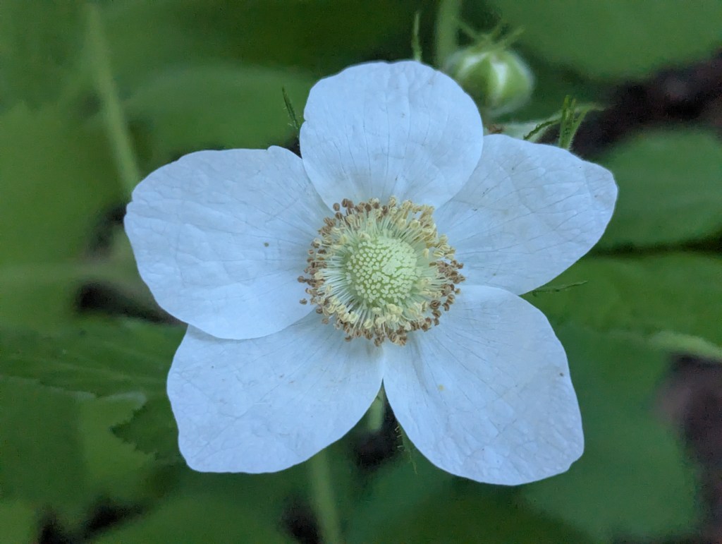 1. Rubus parviflorus, thimbleberry is actually not much to brag about. It just looks more impressive in a closeup picture. This flower is not much bigger than a blackberry flower.