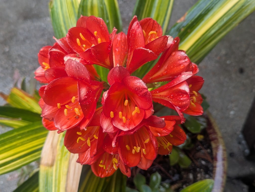 4. Clivia miniata, Kaffir lily got to bloom this year. The same specimen produced a floral stalk which got broken off last year. This particular cultivar has yellow foliar variegation.