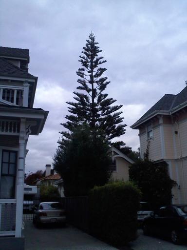In coastal areas of Southern California, the Norfolk Island pines, Araucaria heterophylla, are among the most distinctive large trees. Perhaps they are better described as ‘unusual’ . . . , or even ‘strange’. They are so symmetrical that they seem to have been assembled from prefabricated kits than to have grown as natural trees. Their strictly organized conical branch structures and remarkably straight central trunks are always visible through their uniformly open canopies. In such mild climates, they can get nearly a hundred feet tall and half as wide, so are not easy to hide. In Hawaii, their symmetry has actually made them popular as Christmas trees. Their finely textured juvenile foliage is comprised of narrow, half inch long pine-needle like leaves, which are wider among adult growth.