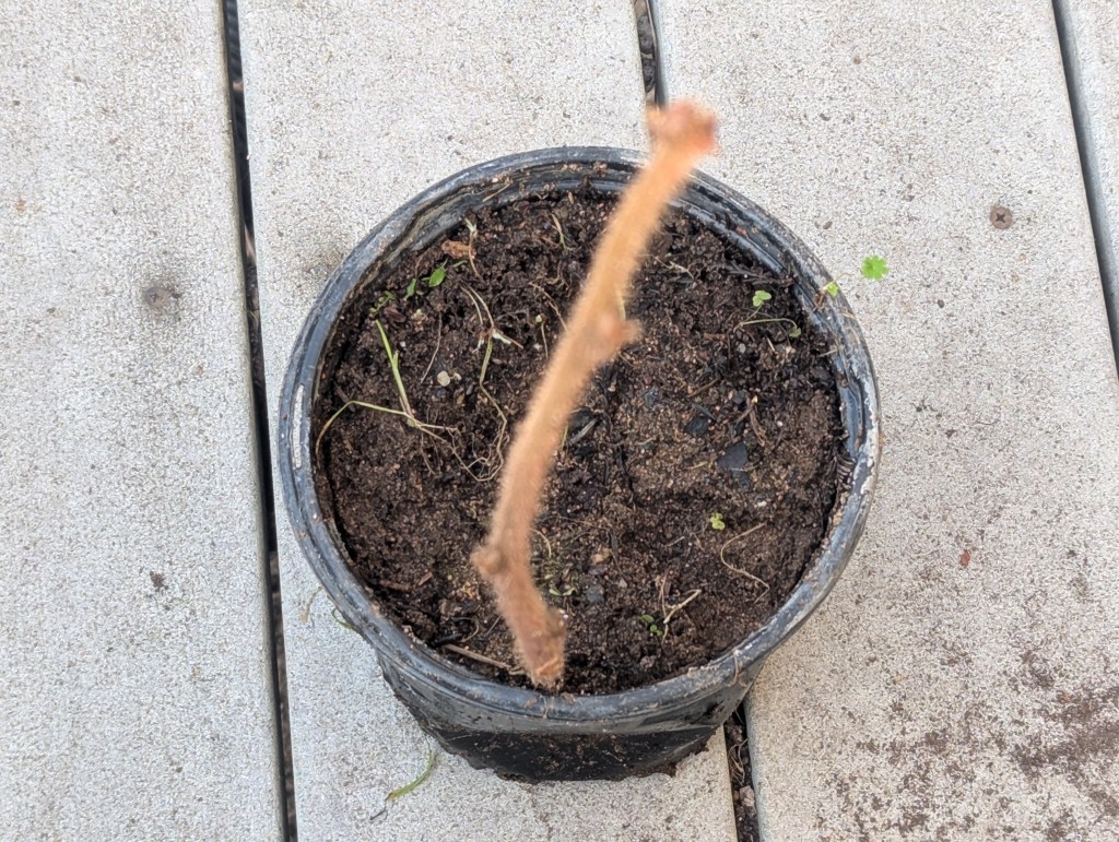 My female kiwi vine just recently acquired a male pollinator. It does not look like much yet, but will grow up to bloom with male flowers to provide pollen for the female flowers of the vemale vine. Because kiwi vines are dioecious, the female vine would be fruitless without pollination from the male vine. Perhaps the male pollinator will need a pollinator to deliver its pollen to the female vine.