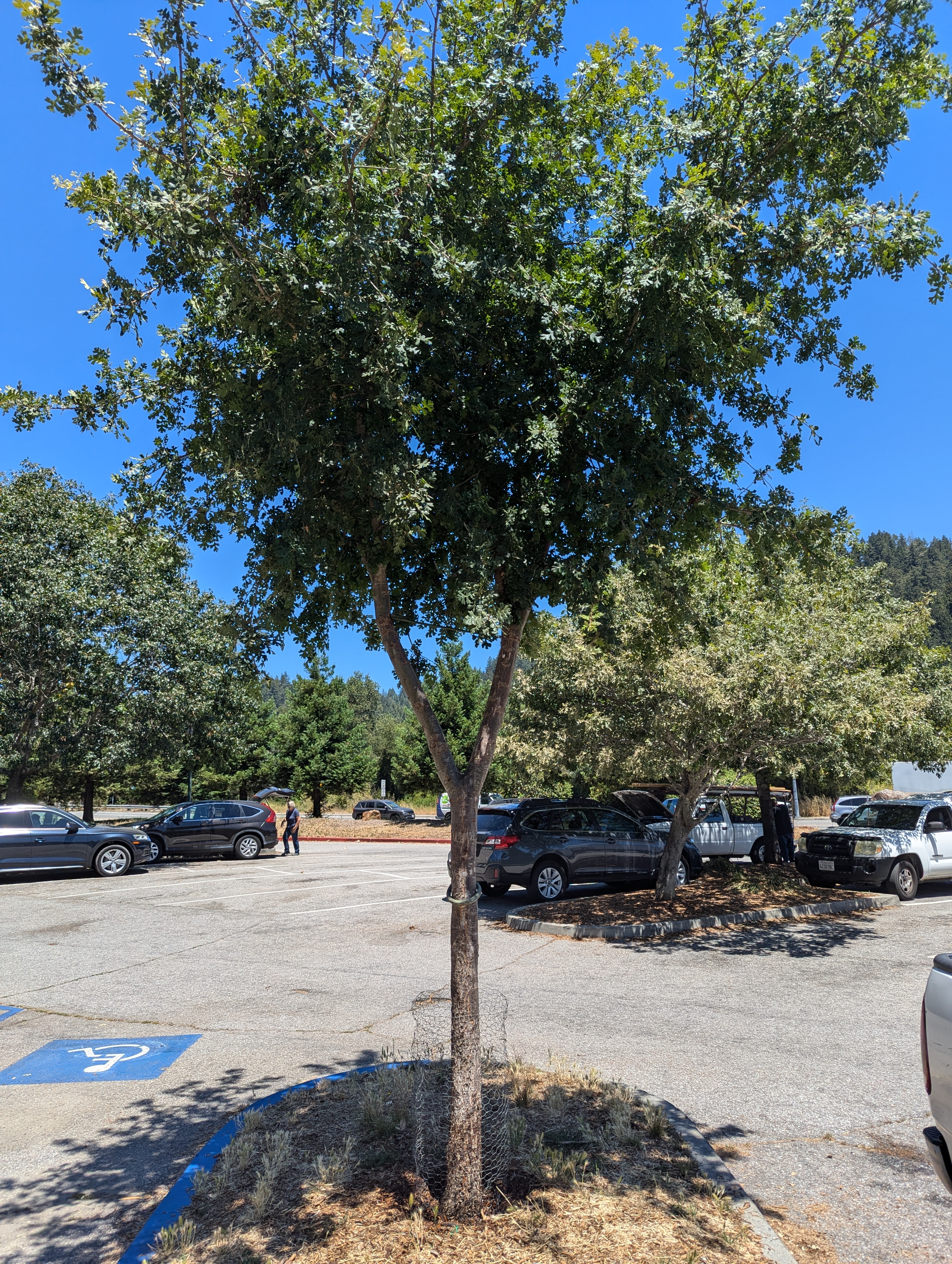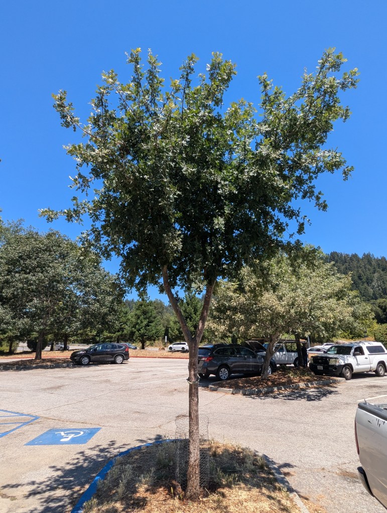 The young Memorial Tree in Felton Covered Bridge Park continues to grow at an impressive rate. It is still as remarkably healthy as it has always been. Now that the canopy has been directed upward and over the surrounding parking lot, it is maintaining adequate clearance without intervention. There is not much more to say about it. I suppose that I should conduct these updates in autumn, after growth has finished for the year, but prior to defoliation. For now, I will conform to the tradition of posting this update for the middle of July, as I have done for the past few years, but may also post another later, like I did last year. I was amazed by how much growth developed within the seven weeks between those two updates of July 12 and August 30 last year. Since the Tree is now too big for the size of pictures that I had been taking of it, I should zoom out for subsequent pictures as I did for the picture below, to show all of its expanding canopy. If I had planned it better, I should have taken a picture of the tree every summer from the same vantage.