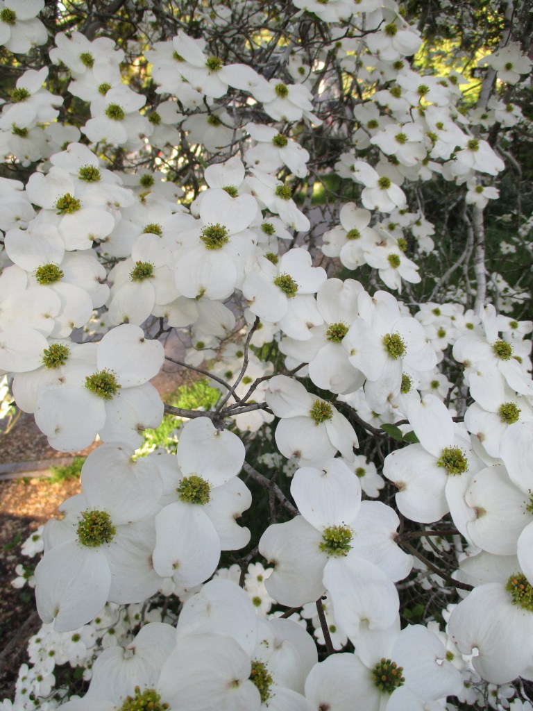 Flowering dogwood, Cornus florida has something in common with Poinsettia. The most colorful component of their bloom is not floral, but is instead foliar. What appears to be petals are colorful leaves known as bracts. Exactly four bracts surround each small cluster of tiny and unimpressive pale green real flowers. These bracts are most popularly white, but can be pink or rarely brick red.