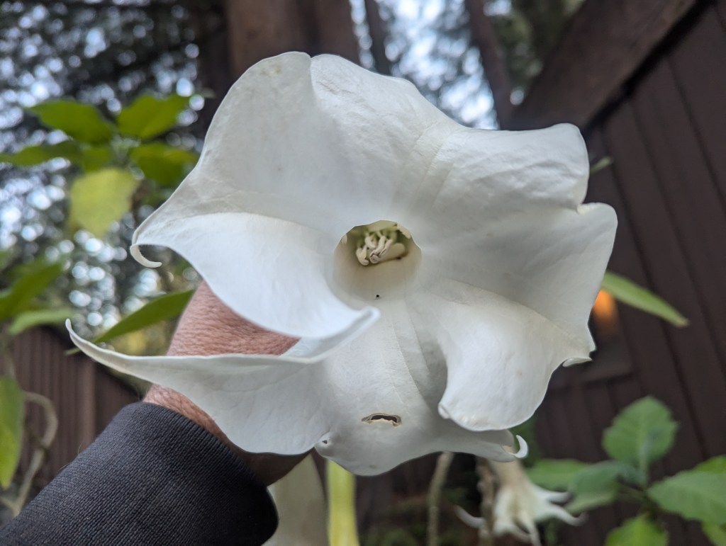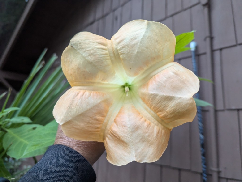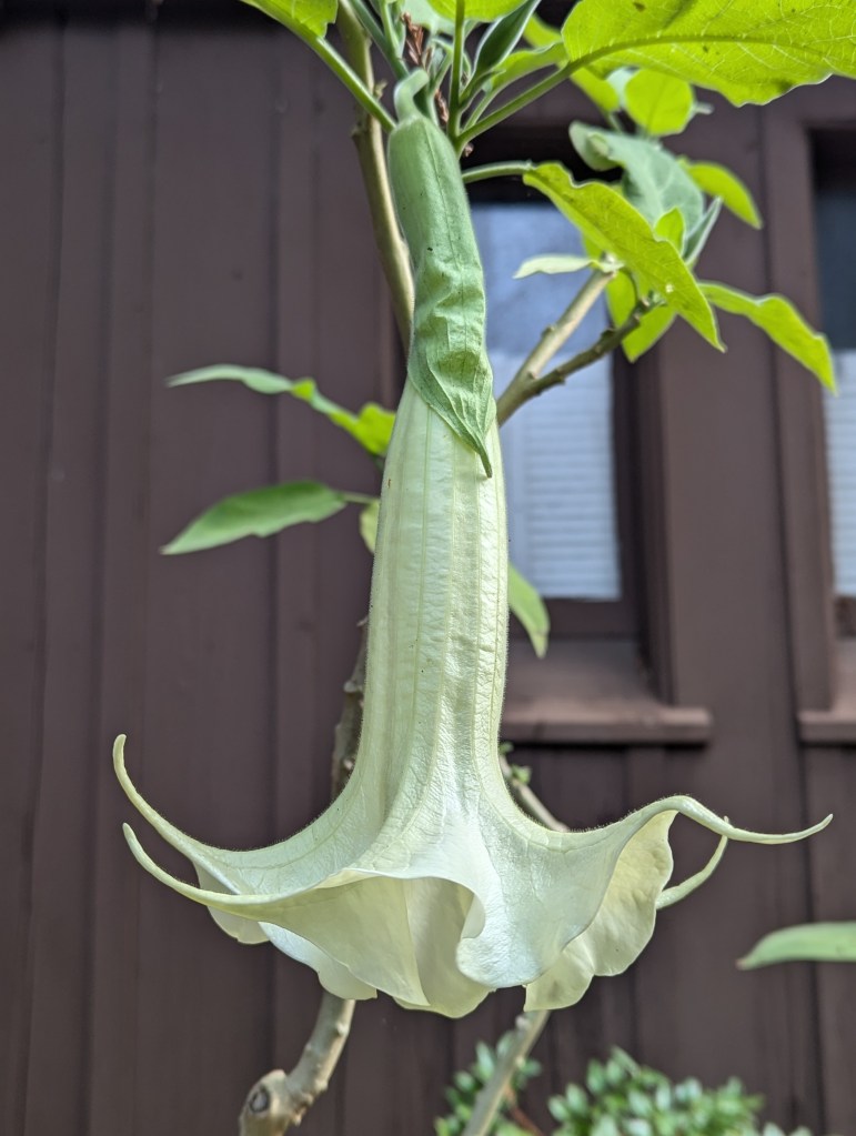 3. This angel’s trumpet flower should be frilly double white. I suppose that it is not so off color. However, it is barely frilly, and lacks double form. I can not complain. It is pretty.