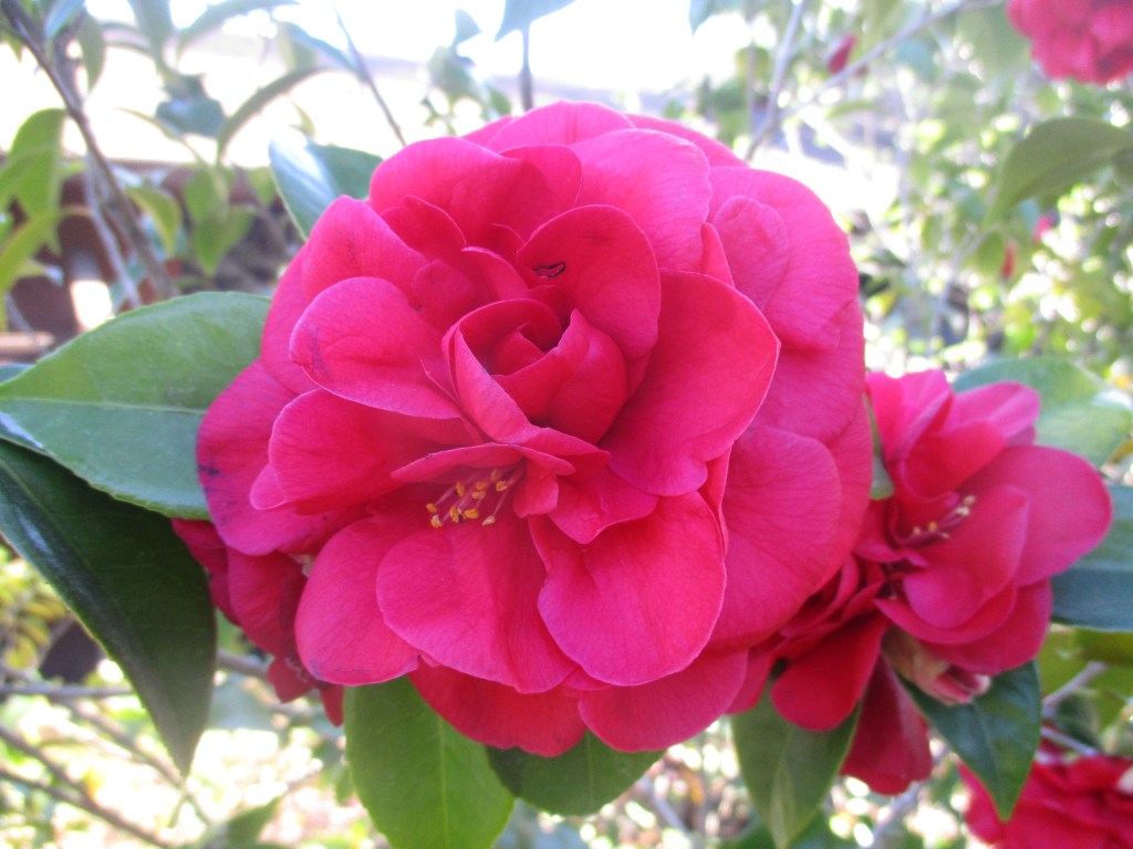 Some might say it blooms very late. Others might say it blooms very early. Regardless, sasanqua camellia, Camellia sasanqua, blooms in autumn or early winter when not much else is blooming. The abundant two inch wide flowers can be pale pink, rich pink, white or red, all with prominent yellow stamens. Some are fluffy with many petals. Others have only a few. Alas, fragrance is rare.