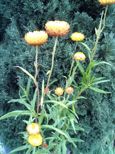 Strawflower can be white, pink, red, orange or yellow. Their seed should be sown directly where they are wanted in spring. Mature plants are about two and half feet tall and a foot wide, with three or four inch long and somewhat narrow leaves. Dwarf varieties are not as good for dried flowers, but are fuller and look better in the garden.