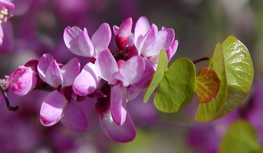 The thin stems of Western redbud, Cercis occidentalis, that had been bare through winter are now outfitted with an abundance of tiny but almost offensively bright magenta flowers. Rounded or nearly heart shaped leaves will become more prominent as bloom fades. As foliage yellows and falls later in autumn, coffee colored pods that are about two inches long remain until they get dislodged by winter weather. Pods can be very abundant on older or distressed plants, or scarce on young or vigorous plants.