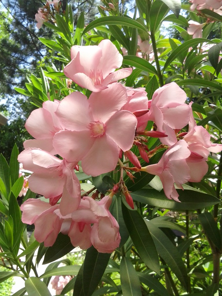 Oleander flowers are about an inch or two wide, with five petals, although some have ruffly ‘double’ flowers. Unfortunately, double flowers tend to hang on as they deteriorate after bloom. Some oleanders are slightly fragrant. The name ‘oleander’ is derived from the similarity of their leaves to those of olive trees (‘Olea‘), although oleander leaves can get three times as long.