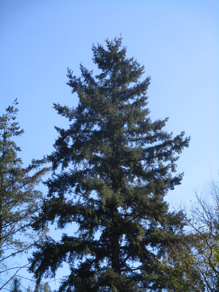 Sitka and Brewer spruce both live at low elevations and near the coast within their native ranges. Yet, neither perform as well here as blue spruce, Picea pungens, which is native to much higher inland regions of the Rocky Mountains. It grows neither as big nor as fast here as in the wild, so few old local trees are taller than thirty feet, or broader than twenty.