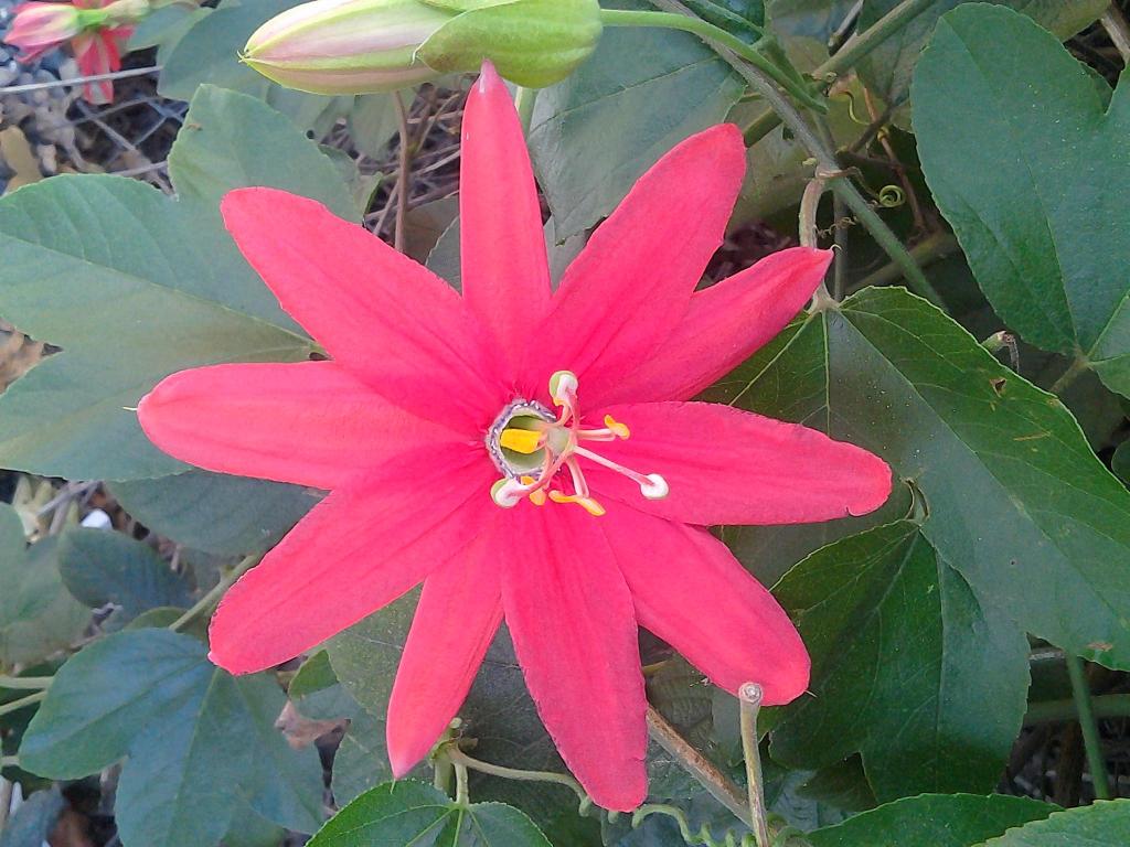 Abundant lush foliage is actually the main asset of blood-red trumpet vine, Distictis buccinatoria, with the sporadic clusters of three inch long tubular flowers blooming as an added benefit during warm weather. Bloom can certainly be impressive when least expected though; and has a sneaky way of getting a late blast of color out during Indian summer weather patterns, when the weather gets warm after a cool phase in autumn. Contrary to the name, the flowers are more ruddy orange with yellow throats than blood red. The rich green leaves are compound, with a pair of three inch long leaflets and a three fingered tendril reaching out from between.