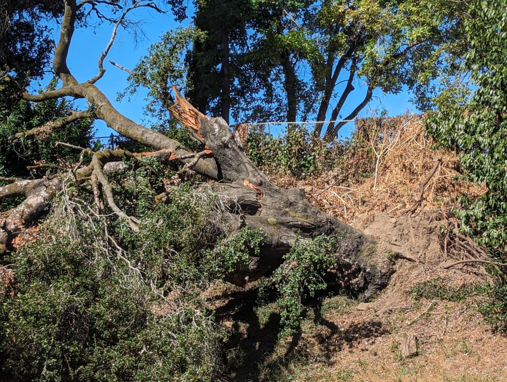 Sequoia sempervirens, coastal redwood is the Official State Tree of California, and the tallest species of tree in the World. One large specimen can contain more lumber than many acres of Douglas fir (really). While some trees ensnare kites, redwoods collect satellites. Redwood lumber can be delivered anywhere in western North America simply by aiming a tree in the direction of delivery while cutting it down. Redwood shadows reach Japan at dawn and New England at dusk. The moon is covered with craters because it could not dodge the growing redwoods while orbiting over California. You can see for yourself how tall redwoods are just by looking in this direction from wherever you are in the World. Unfortunately though, not all of the debris that falls from the huge canopies of redwoods burns up in the atmosphere on its way down. Such huge canopies generate a lot of debris. Almost all of it is finely textured foliar debris. Some is twiggy detritus. The worst of it are significant branches. The descent of most of such branches is slowed by lower branches and foliage that they encounter on their way down. However, the lowest branches of some canopies are very high up, and falling branches resume acceleration after falling past them. Also, some falling branches fall outside of their canopies. Even branches that weigh only a few pounds can be extremely dangerous. Many falling branches weigh many pounds, and some are as big as trees. The fallen branch in the picture above is only several feet long and about three inches wide, (and happened to fall through the only three inch wide plank in a pedestrian bridge. The replacement plank needed to be custom cut.) I am annoyed by this relatively minor damage, but also relieved that it was not worse.