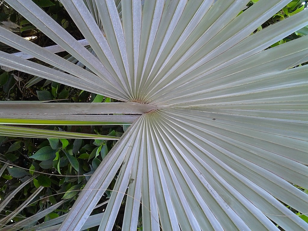 The primary allure of Atlas Mountain palm, though, is its distinctly silvery gray foliar color. Individual fan shaped leaves may be nearly two feet broad, with deep and narrow clefts. Petioles are so nastily thorny that grooming and pruning can be painfully difficult. Mature trunks can be six inches wide with dense coats of petiole bases. Bloom is not prominent.