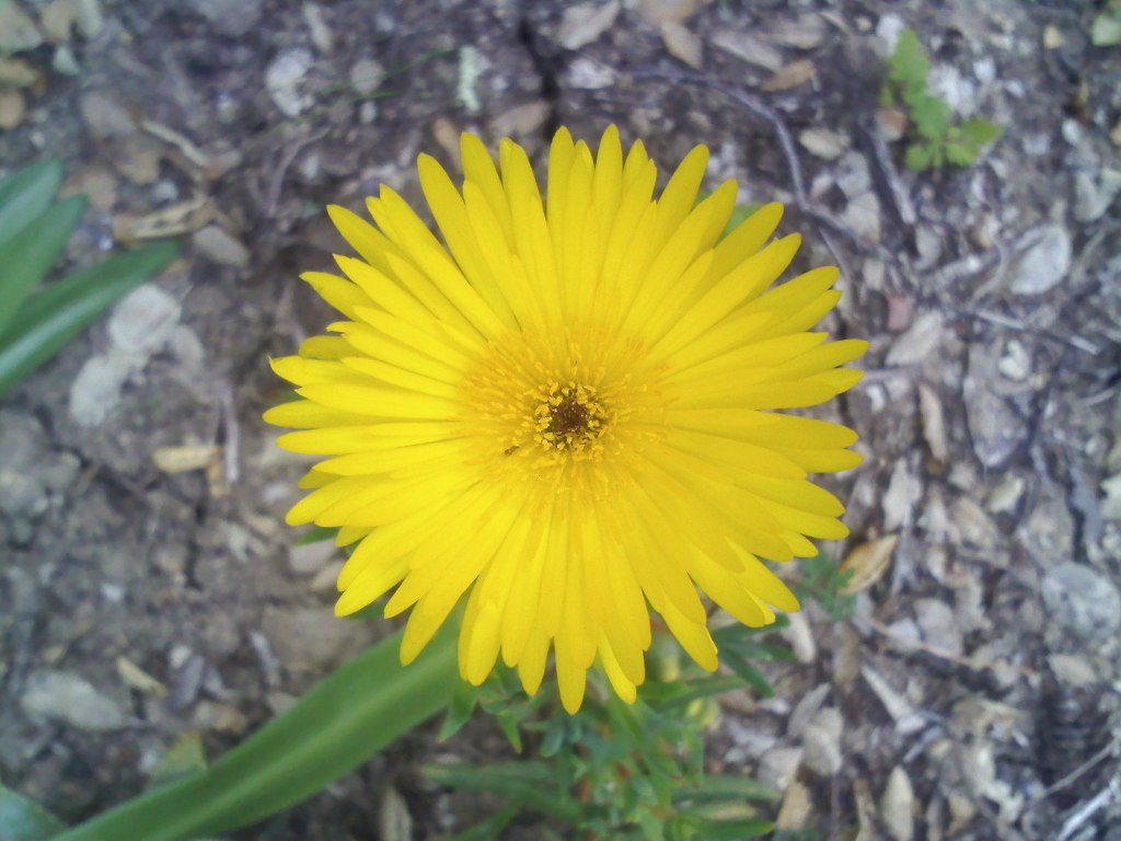 The bright orange, inch and a half wide flowers of Lampranthus aurantiacus, a type of ice plant, should bloom between winter and spring, but a few are brightening my garden right now. This bright yellow flower in the picture is that of the variety ‘Glaucus’, which I grew from a cutting last year. My single low mounding plant is about a foot wide now and will eventually spread to about two feet wide, and can get about a foot deep. Stems can root where they lay, forming new plants that will spread farther. To accelerate the spread, more plants are very easy to propagate from small cuttings. Lampranthus aurantiacus has narrow, inch long leaves, and a relatively shrubby basal branch structure.
