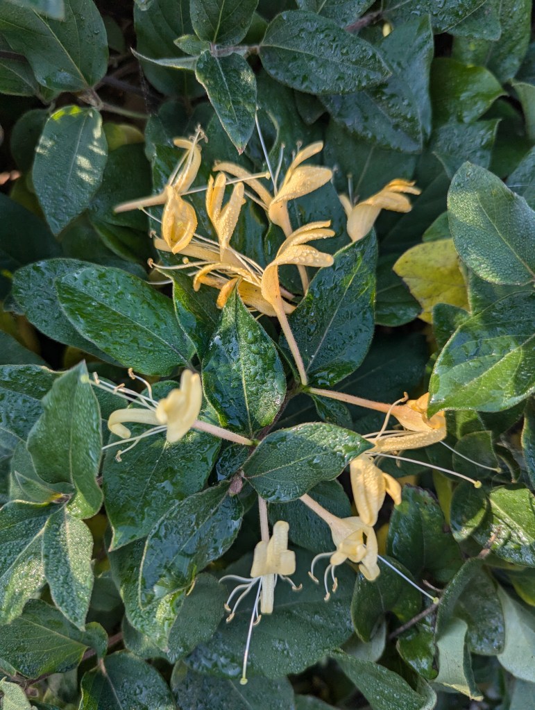 Bloom should be most abundant during late spring and summer. Within this mild climate though, it often continues sporadically through autumn. Japanese honeysuckle, Lonicera japonica, is presently blooming nicely in some areas. Its trusses of ribbony creamy white flowers fade to pale yellow. Although unimpressively colorful, they are alluringly fragrant.