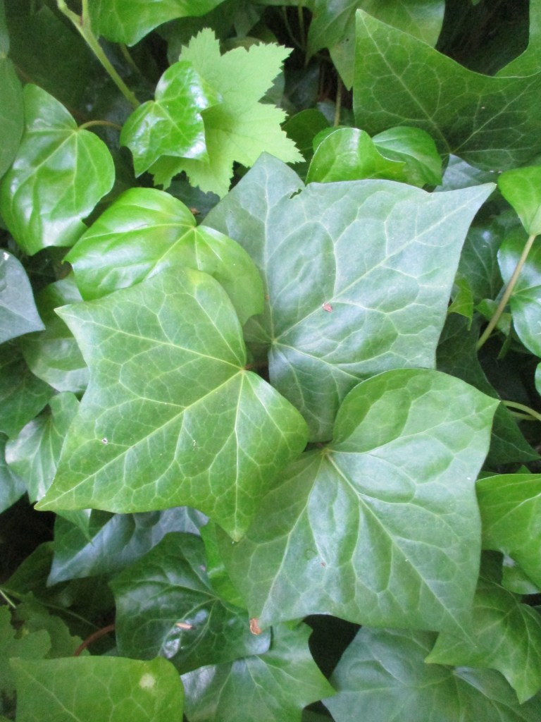 Algerian ivy is neither as finely textured nor as shallow as English ivy. Its broader leaves are about six inches wide, with blunter lobes. They stand higher on longer and distinctly blushed petioles. Algerian ivy is rare in nurseries now, but inhabits old landscapes, from which it sneaks into adjacent landscapes. Variegated cultivars are slightly more passive.