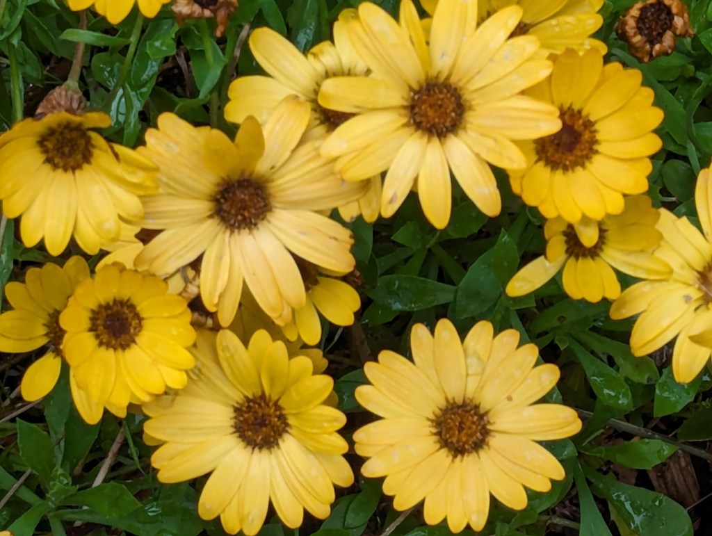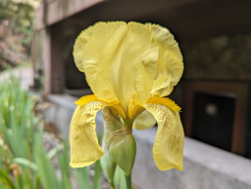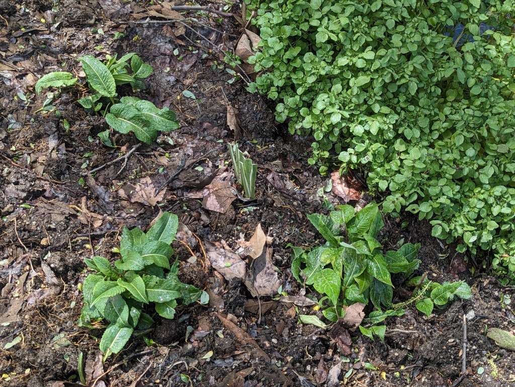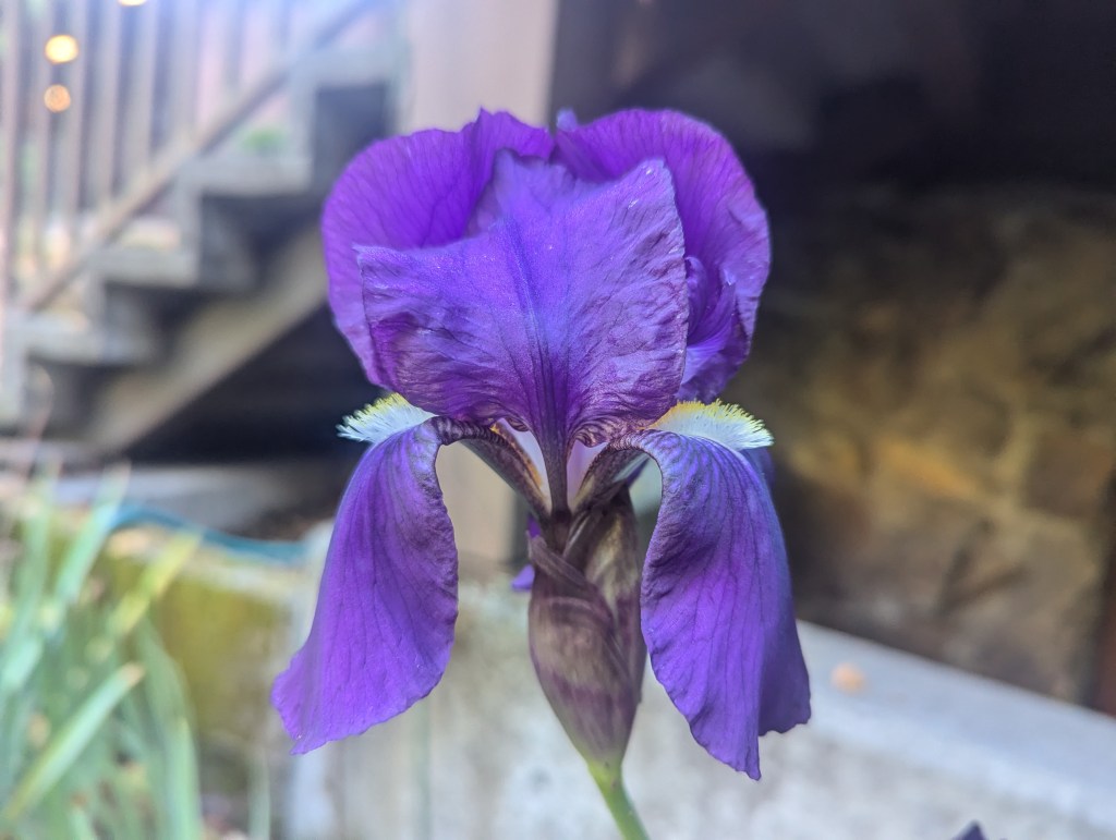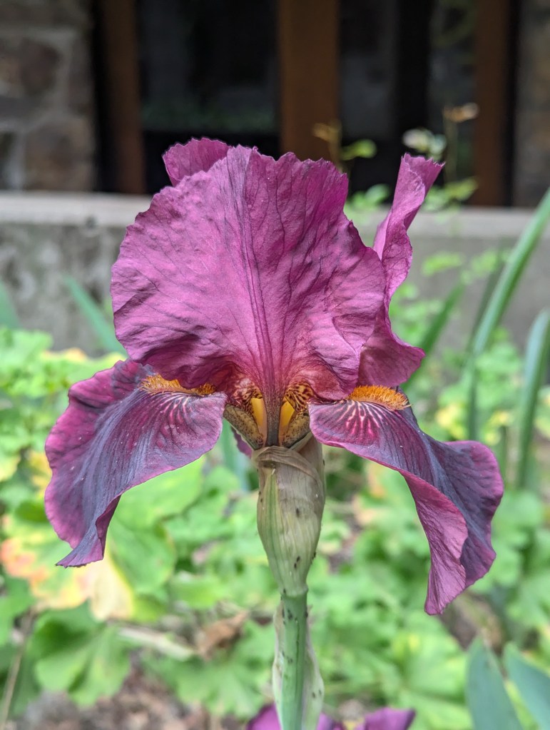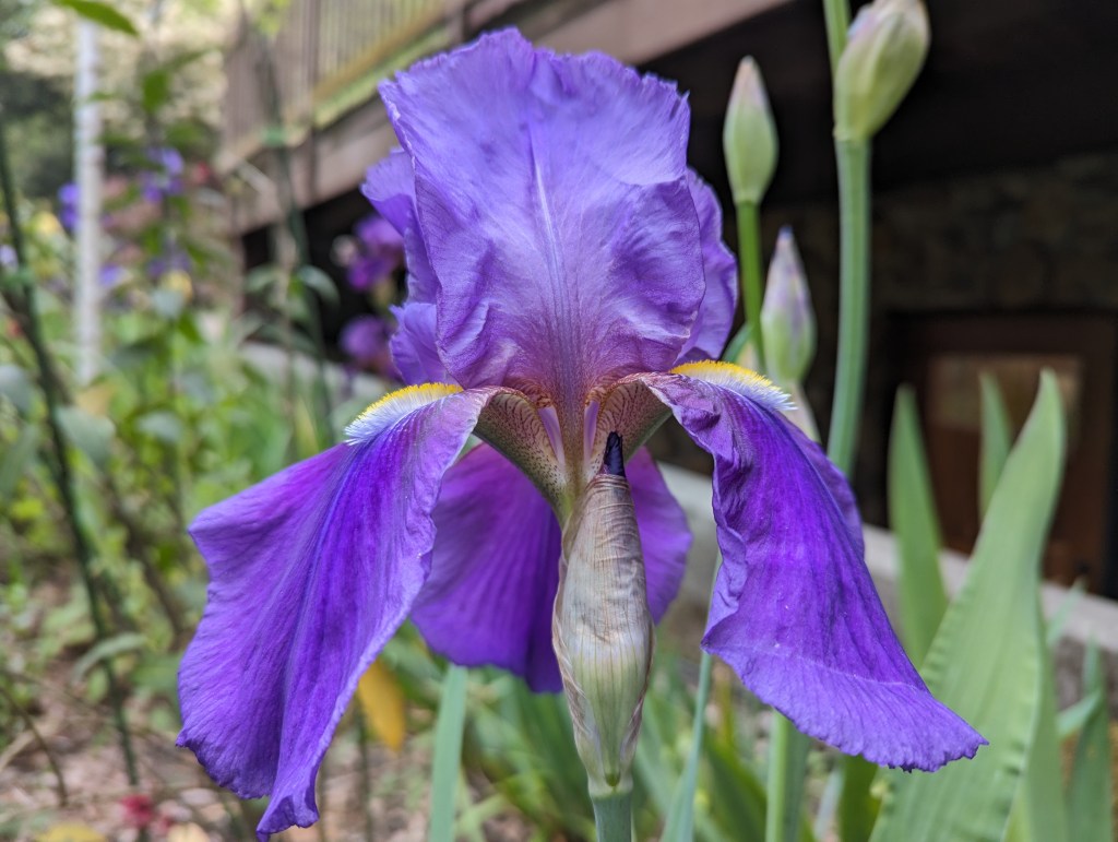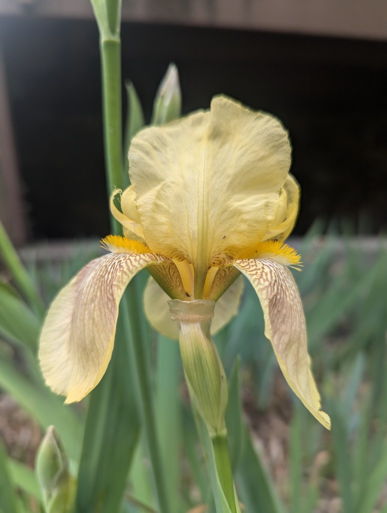 Finally, after two years, ‘Black Gamecock’ Louisiana iris from Tangly Cottage Gardening are blooming! At the end of winter of 2023, I divided a significant clump of them into enough pups for a thirty foot long row on the edge of the irrigation pond. They grew through summer, and should have bloomed for the following spring. Instead, a gopher ate all but a few pups. At the end of winter of 2024, I divided another clump into enough pups for a twenty foot long row in the same location, but closer to the water. Again, they grew through summer, and should have bloomed this spring, but instead, all but a few were eaten by a gopher. These that are now blooming are the survivors from the original batch, which were canned for their safety. They are blooming late, probably because they would rather be in the ground than canned. I will divide these into more cans now so they can proliferate and be divided again later, until there are twice as many as necessary for the edge of the pond. Then, I will plug some at the edge of the pond, into saturated soil that gophers can not dig under.