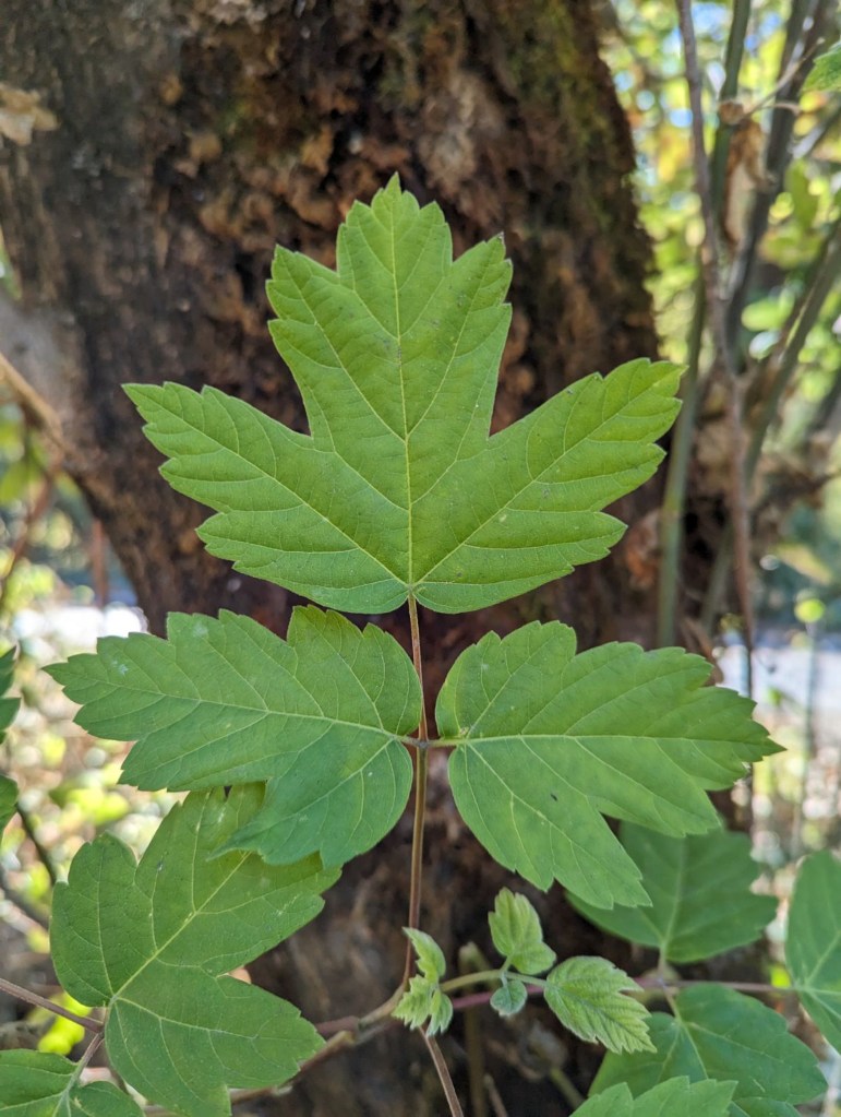 Bigleaf maple can grow almost fifty feet tall and wide within sunny suburban landscapes. It can grow a hundred feet taller where it competes for sunshine within coastal forests! Its palmately lobed leaves are typically wider than six inches. They can be twice as wide on vigorous stems. Foliage turns yellow for autumn. Seedlings might be annoyingly prolific. Local climate is unfortunately not conducive to practical sugar collection and refinement.