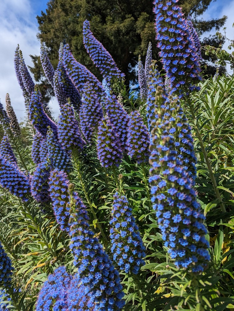 This is most certainly something to be proud of. Pride of Madeira, Echium candicans (or fastuosum), can bloom perfectly blue. Varieties that bloom white or lighter lavender blue are rare locally. Feral specimens might exhibit such floral color variation though. Bloom occurs only annually, but can last through spring. Butterflies and bees are very fond of it.