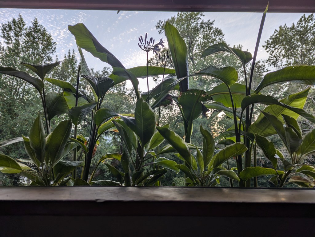 4. Alocasia odora, taro, or whatever species this is, has grown quite nicely to obscure its pot, just like the split-leaf philodendron and Sigmund. It was taken from a vacated home with an Australian tree fern two years ago. Sadly, the old home will soon be demolished.