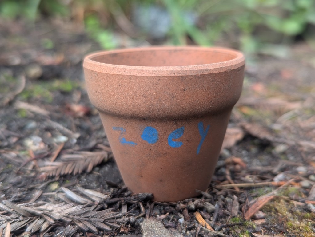 3. Cymbidium, orchid with a few small bits of Vinca minor ‘Alba Variegata’, small white variegated periwinkle are in a cheap plastic urn, with Sigmund in the background to the left. I know neither the species nor the cultivar of the orchid, but it blooms white nicely.