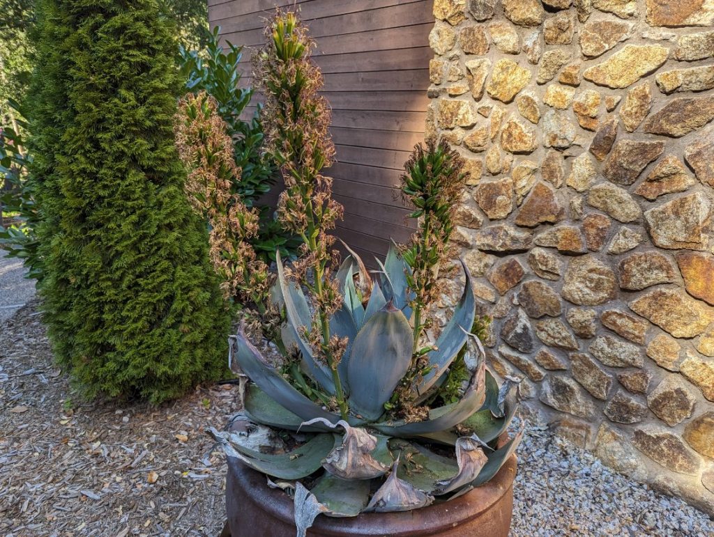 Agave ovatifolia, whale tongue agave, was purchased by the other horticulturist for a specific situation. It was a striking specimen that was worth what was spent on it. However, it began to generate pups almost immediately after installation, and then suddenly and unexpectedly bolted and bloomed. It was disappointing for such an expensive specimen of a monocarpic species. We removed it after bloom, with the intention of replacing it with one of its several maturing pups. Of course, I could not simply dispose of its carcass. I canned it like a dormant perennial, just in case it did something. Well, now it is doing something! It is bolting and blooming from the grave! I expect more pups soon. We really should get all the Agave spayed!
