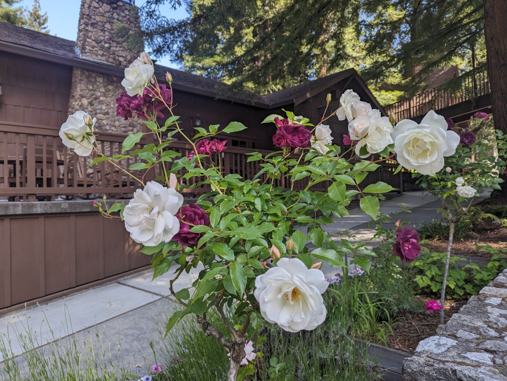 2. Rosa ‘Iceberg’ and ‘Burgundy Iceberg’ are grafted together on two old rose trees in the rose garden. I find multiple grafts to be annoying, but guests find them to be intriguing.